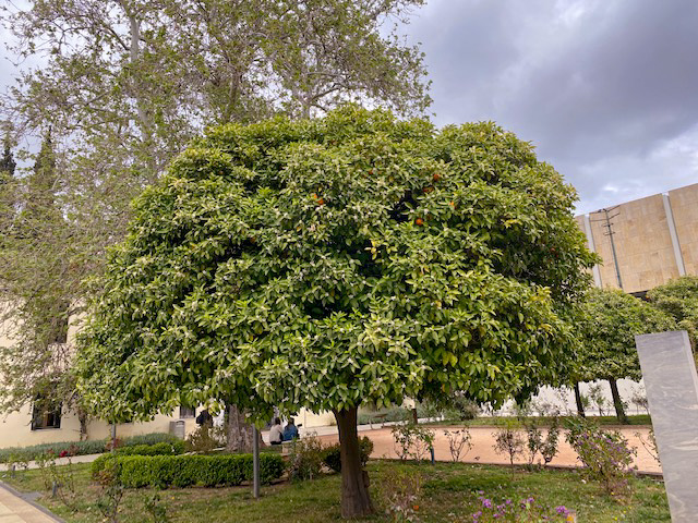 Die hohe Zypresse auf dem Innenhof ist schon eindrucksvoll genug, aber noch erstaunlicher sind die Orangenbäume. Sieht der Baum nicht aus, als hätten ihn Mönche in fernen byzantinischen Zeiten gepflanzt`?