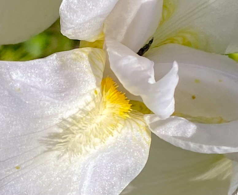Das Innenleben der nun erblühten weißen Garteniris ist zwar sehr sehenswert, scheint aber für Bienen ohne Interesse zu sein.