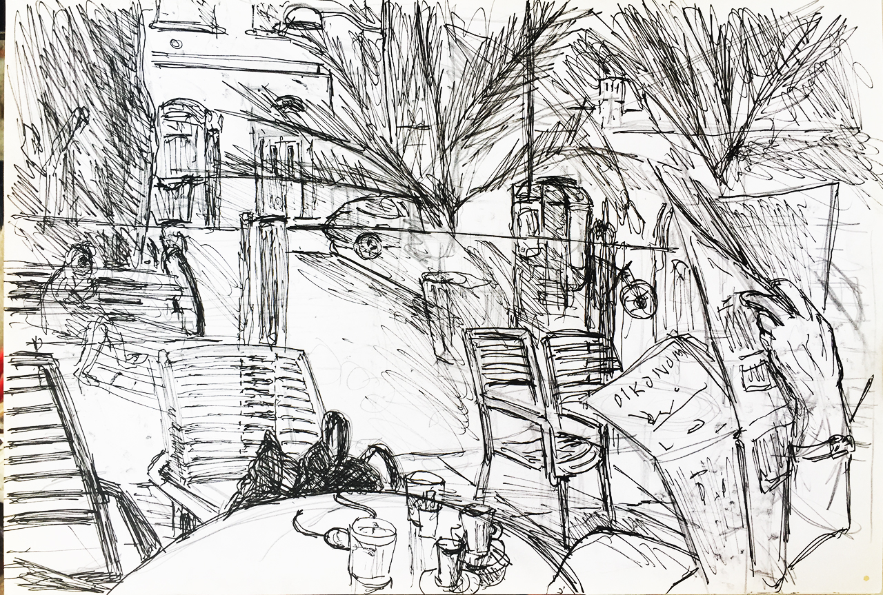 Hier haben sich zwei Tassen auf einem Tisch in einem Gartenlokal eingefunden, dazu auch ein Zeitung-lesender Mann, Wassergläser, eine Brille und Palmen, Stühle und einen Rucksack gibts auch. Und natürlich auch eine Frau, die all das sieht, zeichnet und genießt.