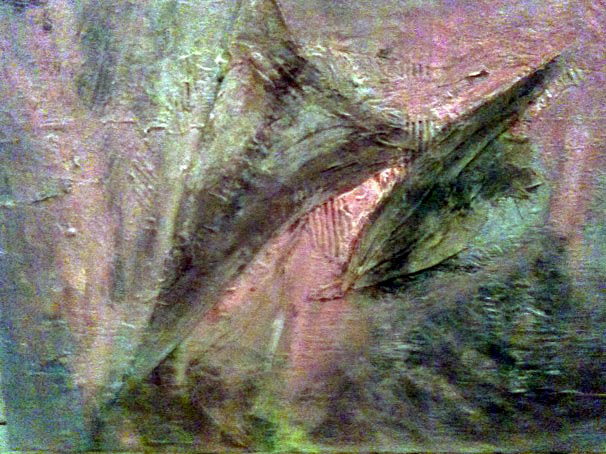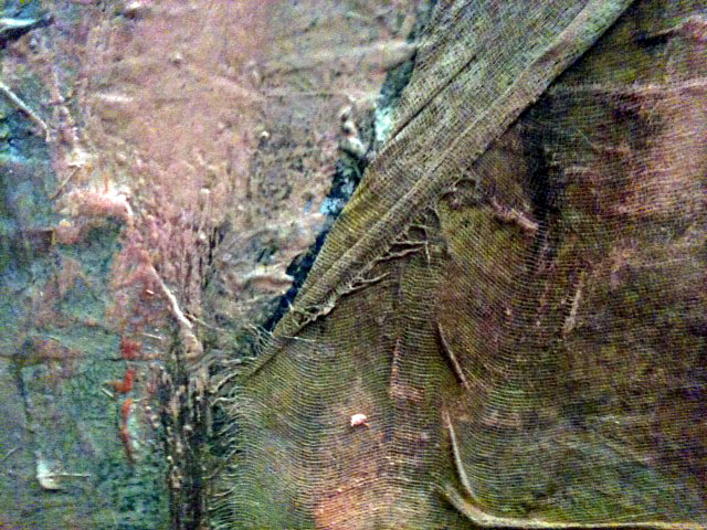 Ich nehme wie so oft bei meinen eigenen Bildern Zuflucht. Gibt es da Anknüpfungen, Parallelen? Etwa diese verwundete Leinwand?