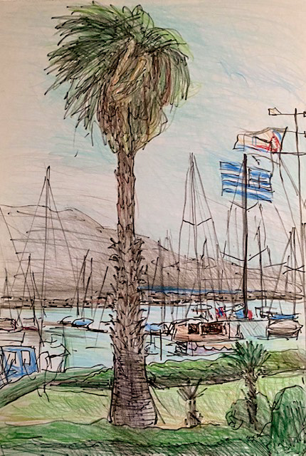 Das Cafe am Segelhafen ist ein guter Ort, um sich zu verabreden. Es gibt reichlich Platz, alles ist hübsch mit Blumen und Grünpflanzen geschmückt, ein Springbrunnen befeuchtet die Atmosphäre, und man hat einen schönen Blick auf die Marina. Die zeichnete ich bei meinem letzten Besuch dort.