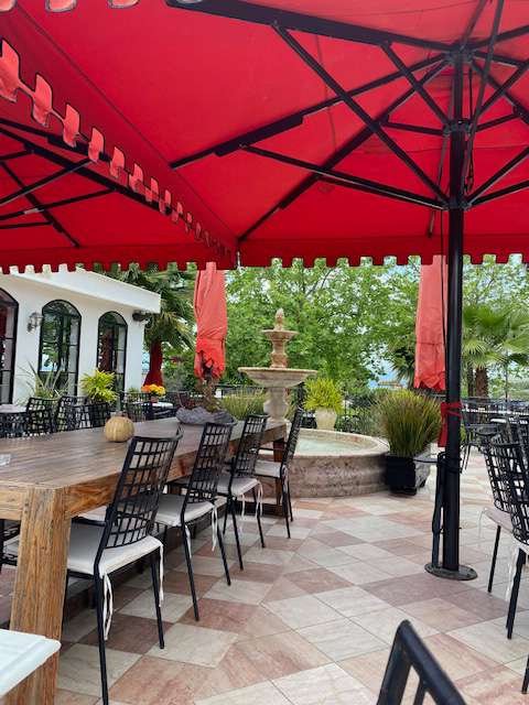 Nach unserem Treffen blieb ich noch ein Weilchen allein dort sitzen, um die Farben anzudeuten. Denn es war der Kontrast zwischen den roten Sonnenschirmen und dem Grün des Gartens, der mich zum Zeichnen gereizt hatte.