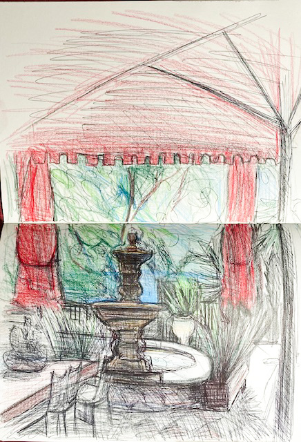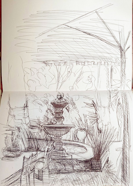 Heute schaute ich in die entgegengesetzte Richtung, mit Blick auf den Springbrunnen, während ich auf die Freundin wartete. Für die Zeichnung benutzte ich eine Doppelseite meines Skizzenbuchs und einen Kugelschreiber.
