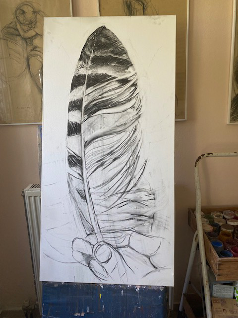 Heute will ich eine Feder studieren, indem ich sie auf einer großen Leinwand 60 x 120 cm mit Kohle zeichne. So weit kam ich bis zum Mittagessen.