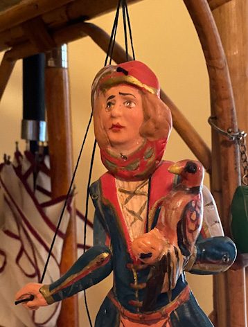 Ich weiß nicht, wie diese Figur in unserem Haushalt gelandet ist. Ich liebe Marionetten, wollte ursprünglich das Herstellen und Spielen mit Marionetten zu meinem Hauptberuf machen – aber wie so vieles andere auch (Flusskapitänin, Regieassitentin, Zigeunergeigerin) blieb dies Vorhaben in den Kinderschuhen stecken und geriet, als diese abgelegt wurden, in Vergessenheit.