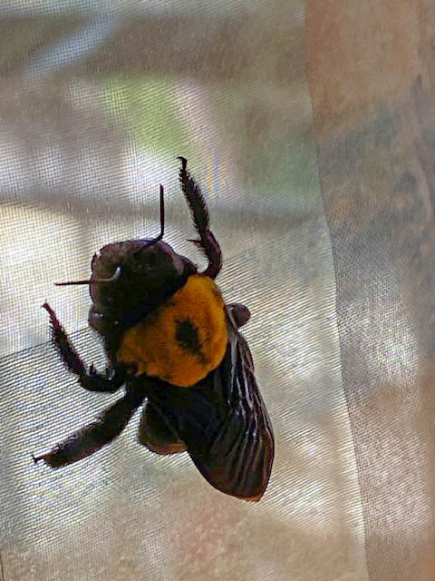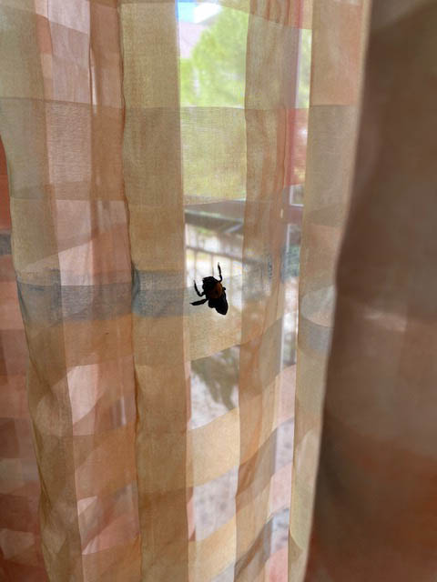 An der Gardine saß ein dickes dunkles Insekt. Ich fotografierte es und half ihm dann, den Weg nach draußen zu finden. Mit schwerem Gebrumm machte es sich von dannen.