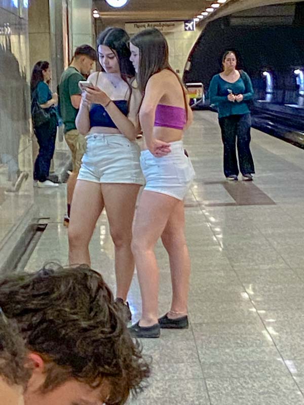 Und damit ihr euch nicht ärgert, wenn ihr das Rätsel nicht lösen könnt, füge ich noch einen unverrätselten Schnappschuss von derselben Station hinzu. Ich hoffe, die beiden Hübschen werden mir verzeihen, dass ich sie heimlich fotografierte (zumal sie sich ständig gegenseitig fotografierten, und ihre Fotos sicher zu Hunderten im Netz kreisen).