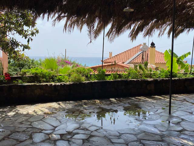 Die letzten Tage war die Atmosphäre sehr schwer von Saharasand. Heute endlich regnete es. Ich hatte die Freude, dem prasselnden Regen vom Tavernentisch aus, den wir rasch unter den schützenden Vorbau getragen hatten, zuzuschauen.