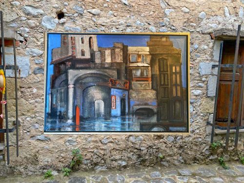 Als Ausstellungsflächen stehen ein paar Meter gemauerte Wände im Hof und am gegenüberliegenden Gebäude der Gasse zur Verfügung. Außerdem können kleinere Bilder hier und da hingestellt und -gelegt werden. Da diese Voraussetzungen nicht ganz einfach sind, habe ich bereits begonnen, mir ein mögliches Konzept zu überlegen und einige meiner Bilder in die Kulisse hineinkopiert. Beispiele;