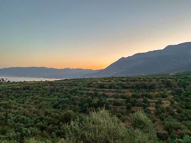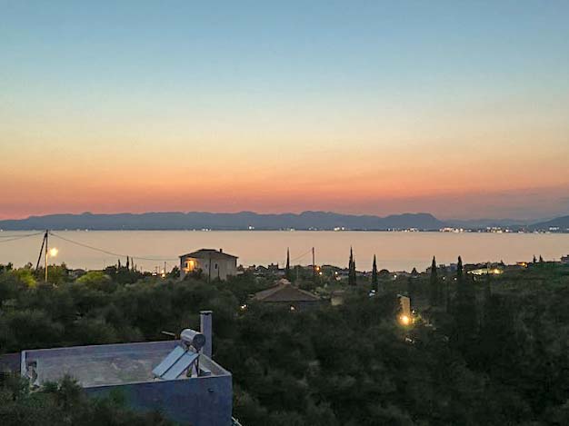 Wie man sieht, liegen die am Morgen und am Abend geröteten Himmelsbereiche sehr nah beieinander: am Morgen im Einschnitt zwischen dem Vorland und dem ansteigenden Taygetos-Gebirge, am Abend über der Landzunge des ersten „Fingers“ der Peloponnes.