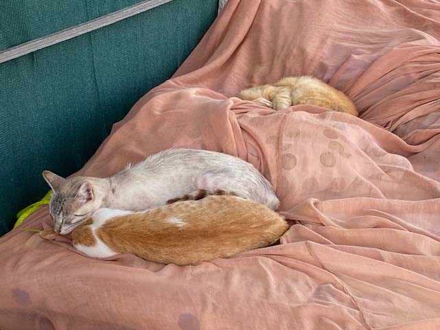 Wie Katzen zu ruhen, das ist eines der Ideale, die ich nicht leicht erreiche. Heute aber war ich nahe daran. Ich hatte nämlich recht früh mein luftiges Lager auf der Turmterrasse geräumt – eine Fliege und etliche Mücken hatten sich unter das Moskitonetz geschmuggelt und wollten nicht weichen, also wich ich . Auf das abgehakte Netz legten sich sogleich drei meiner Katzen, um zu ruhen.