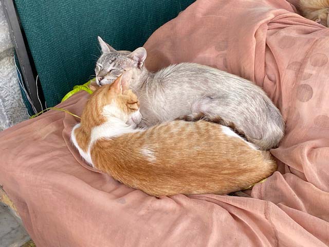 Zwei – ein Kater und eine Katze, beide kastriert – kommen ins Haus, die anderen leben ums Haus herum. Sie sind alle eng verwandt, aber die Mutter aller (Prinkipessa) ist nun verschwunden. Sie war immer extrem scheu und sah zuletzt nicht gut aus. Seit einem Jahr sind es nicht mehr, sondern sogar weniger geworden. Entweder die Kleinen haben nicht überlebt oder sie sind von anderen versorgt worden. Momentan füttere ich 5-7, von denen bis auf zwei – eine Katze und ein Kater – alle kastriert sind.
