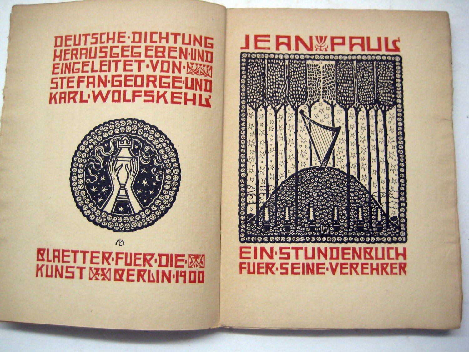 Und die Dichter? Da fällt mir ein Buch ein, das mir einst ein Freund verehrte und das ich in Athen aufbewahre. Es ist hübsch aufgemacht und trägt den Titel: „Jean Paul – Ein Stundenbuch für seine Verehrer“. Stefan George (1868 – 1933) und Karl Wolfskehl (1869 – 1948) haben es 1901 herausgegeben und bevorwortet, Melchior Lechter (1865 – 1937) hat die grafische Gestaltung besorgt.