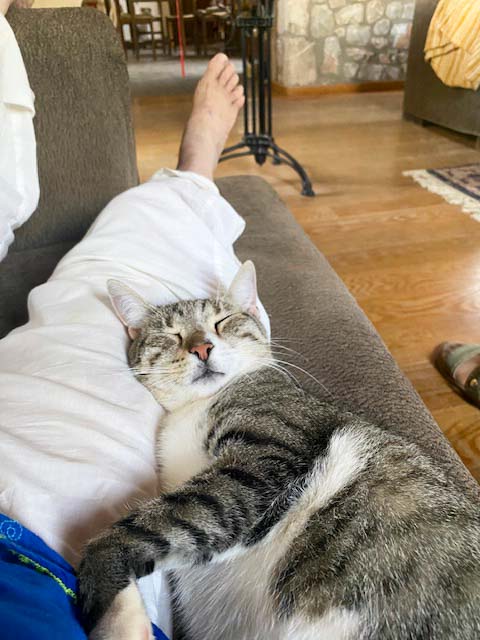 Katzen sind bekanntlich Meister im Entspannen. Fritzi tut es am liebsten an mein Bein geschmiegt, wenn ich mich auf dem Sofa zur Siesta niederlasse. So auch heute. Mir hilft es, zur Ruhe zu kommen. Und so schlummerten wir für eine kurze Weile gemeinsam.