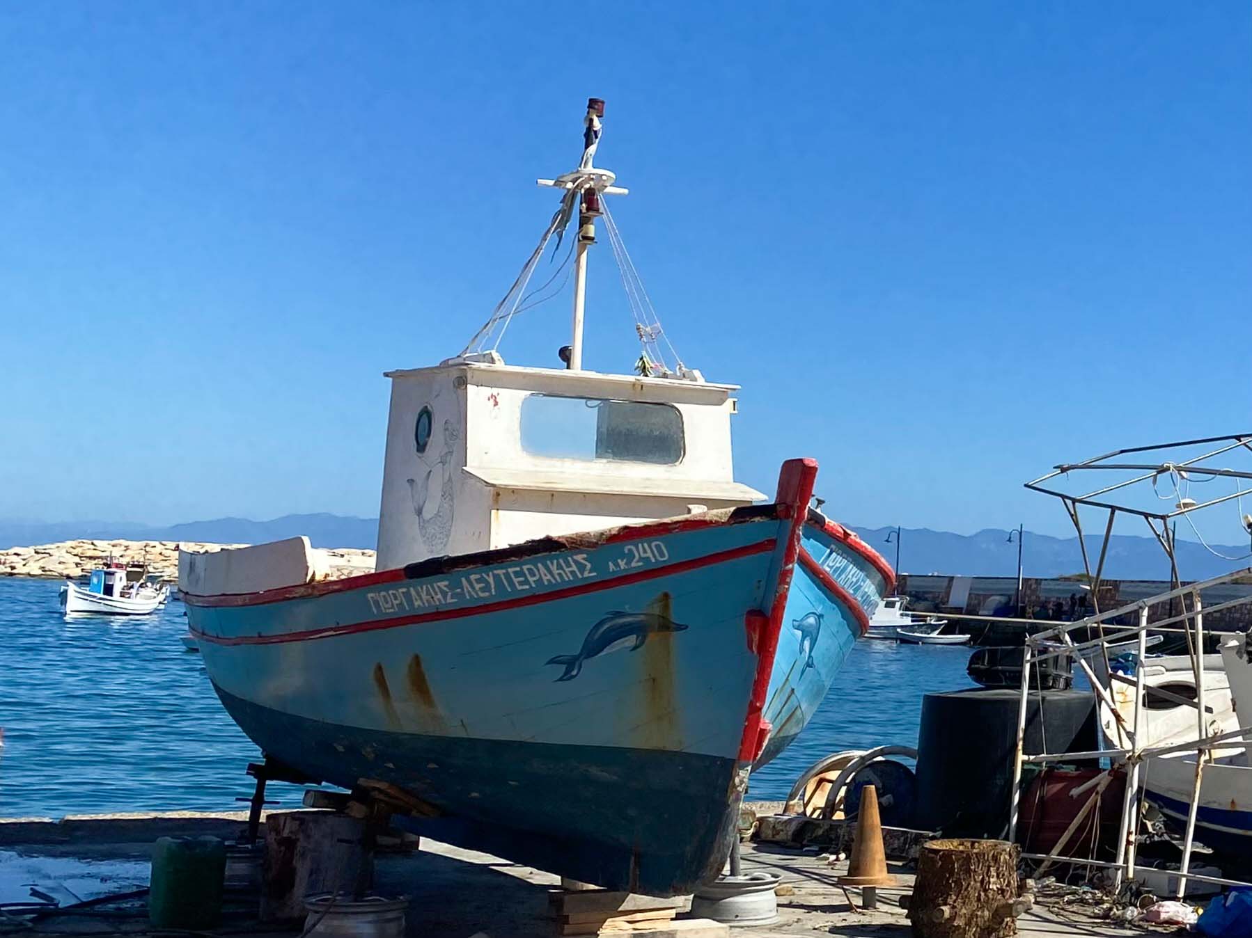Gestern an der Hafenpromenade in Koroni betrachtete ich natürlich nicht nur das Licht auf dem gegenüberliegenden Gebirge, sondern auch die dort aufgebockten Kaikis. Ein    Ka-i-ki ist ein griechisches Fischerboot. Ich bin sehr verliebt in die noch verbliebenen Veteranen. Oft sind sie schon abgetakelt und liegen irgendwo herum, überwuchert von Mittagsblumen, oder auch restauriert als Blumenboot vor Tavernen. Diese hier werden noch mal seetüchtig gemacht. Doch schwerem Wellengang sollte man sie nicht mehr aussetzen.