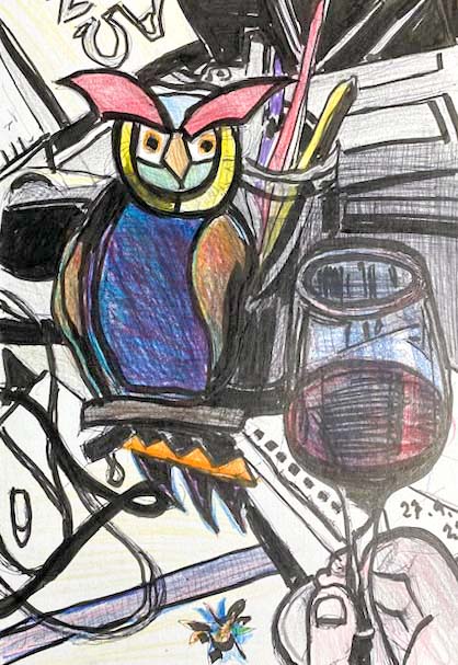 ← Tägliches Zeichnen (15). Eule, Weinglas und Krimskrams
