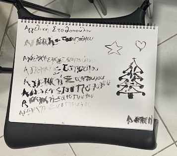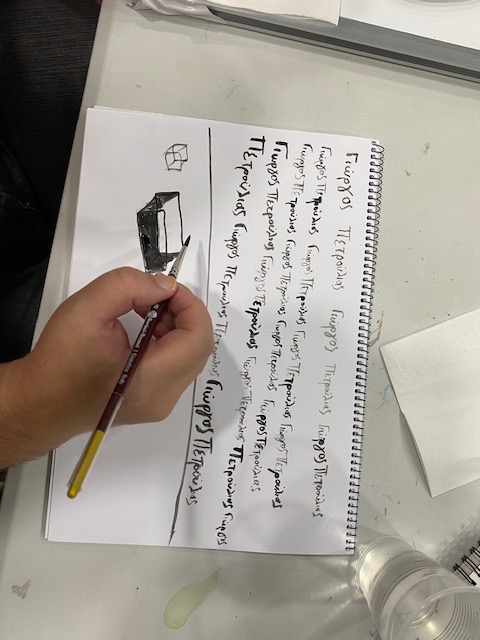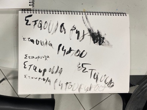 Wir gingen dann zusammen mit aufgespannten Regenschirmen durch die Gassen zum Malen. Dafür bietet der lokale Künstler Dimitris Iliopoulos nicht nur seine Räumlichkeiten an, sondern er leitet die Schüler auch an. Der große Raum ist mit Werken in traditioneller Manier geschmückt: Blumen, Tiere, Landschaften. Der Raum wird auch für gemeinsames Singen des Kulturvereins genutzt. Alles ist säuberlich, einladend und warm. Am Ende erhielt jeder eine köstliche Praline gereicht.