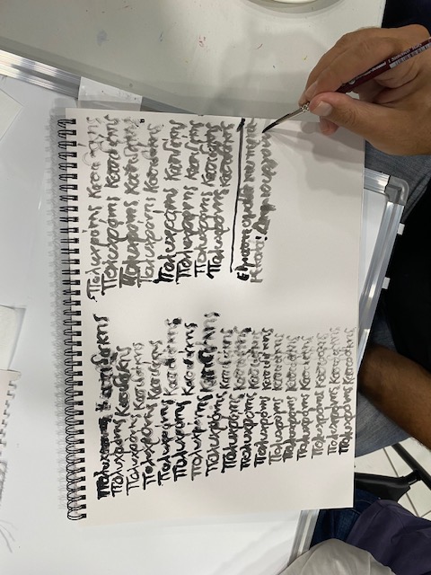 Bei der gestrigen Sitzung galt es, auf einer Seite eines Aquarellblocks den eigenen Namen mit Pinsel und schwarzer Aquarellfarbe zu schreiben – möglichst klein und möglichst die ganze Seite füllend. Und tatsächlich machten sich die Schüler sehr willig ans Werk. Ich verlor unterwegs das Interesse am mechanischen Schreiben, schrieb ein wenig in Spiegelschrift und zeichnete dann ein Segelboot…