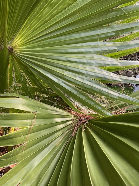 Das strahlenförmige Palmenblatt, nass vom Regen und im Licht des grauen Tages glänzend?
