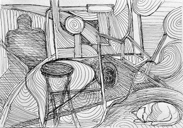 Gestern abend habe ich noch ein wenig mit den Schraffuren weitergespielt. Diesmal versuchte ich nicht, Objekte abzubilden, sondern ließ meiner Fantasie freien Raum. Anregungen nahm ich von Ecken und Winkeln, Rundungen und Geraden des Raums. Ein Teil des Bildes wurde durch eine menschliche Silhouette ausgefüllt. Außerdem nahm eine schlafende Katze im rechten Vordergrund Platz.