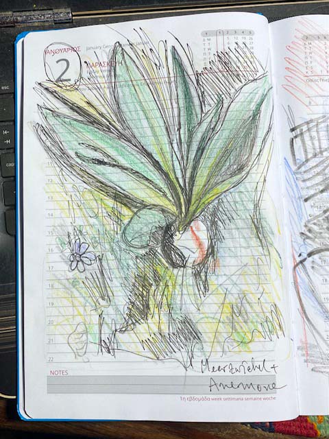 Liebe Susanne, an dich dachte ich sofort, als Christoph dies Kalendertzeichnen vorschlug. Deine Selbstportrait-Kalender über so viele Jahre, die deine jeweiligen seelischen Befindlichkeiten widerspiegeln, sind einmalig. Ich dachte erst auch, ich benutze ein Material, aber ich suche noch herum, es ist noch ein Provisorium, bis sich eine einheitliche Idee herausbildet. Momentan nehme ich einfach etwas, was mir an dem Tag besonders aufgefallen ist, und gebe es mit den Stiften, die ich zur Hand habe, wider. Ich möchte gern einen Rhythmus finden, also immer ungefähr zur gleichen Stunde zeichnen, aber dann ginge es nur drinnen.