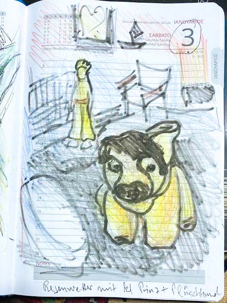 Doch dann fasste ich mir ein Herz. Nur frisch drauflos! sagte ich mir. Ich nahm meine Buntstifte und zeichnete den Kleinen Prinzen, den ich grad zum Jahresdämon erkoren hatte, als Fantasiegestalt. Am zweiten Januar machte ich einen weiten Spaziergang, dabei machte mir eine dicke Meereszwiebel mit kräftigem Blattgrün besonderen Eindruck. Am dritten Januar regnete es, und so kam der Plüschhund an die Reihe, der auf dem Schreibtisch Wache hält, und hinter ihm der kleine Prinz. Heute, am 4. Januar, war ich am recht wilden Meer, das neues Geröll an die Küste warf.