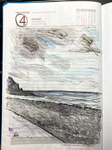 Christoph (hier) machte im vergangenen Dezember den Vorschlag, jeden Tag eine Zeichnung in einem Kalender anzufertigen, so dass am Jahresende 365 Zeichnungen wie in einem Erinnerungsbuch zusammengefasst sind. Die Idee gefiel mir. Ich kaufte sogleich einen dicken linierten Kalender in einem Format zwischen A4 und A5 (also etwas kleiner als Schreibmaschinenpapier), und am ersten Januar begann ich schüchtern mit meiner ersten Skizze. So ein Riesenprojekt schüchtert mich eben ein. Ich wollte ja den Kalender nicht gleich am Anfang versauen.