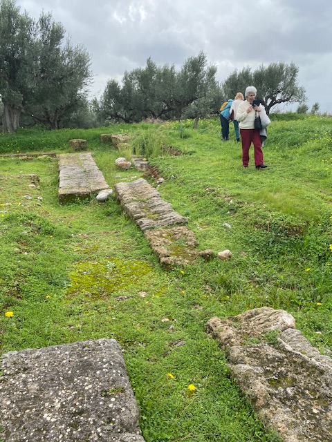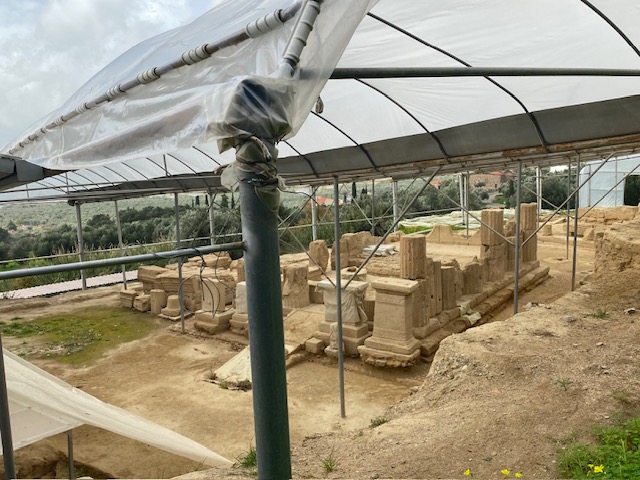 Inzwischen ist der ganze Hügel aufgegraben. Zwischen den Oliven sind Mauern, Säulenglieder, Wasserrohre zum Vorschein gekommen. Die wichtigsten Teile – insbesondere das große Theater – ist mit Plastikbahnen gegen Witterung geschützt, eingezäunt und abgesperrt, das Asklepiosheiligtum zusätzlich mit Schutzdächern versehen, das Kirchlein hat ein neues Dach und einen frisch gemauerten Vorplatz erhalten… ein wunderbarer Ausflugsort, denn all dies liegt auf der Höhe eines grünen Hügelzugs mit weitem Ausblick auf die messenische Ebene.