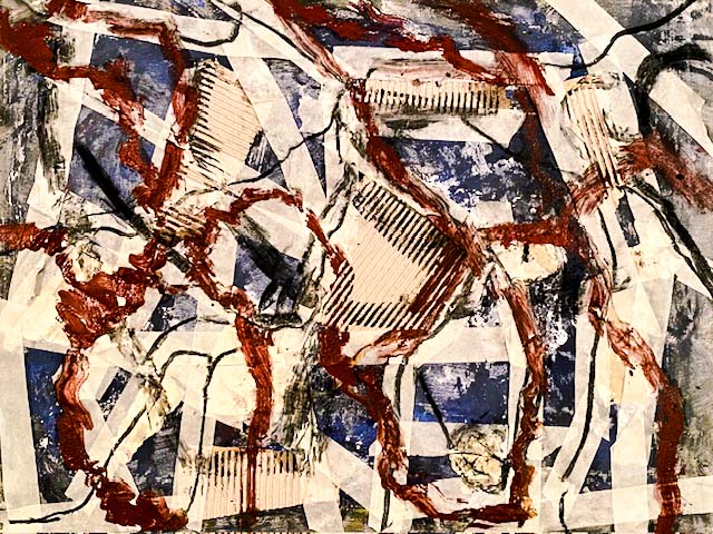 4 Stadien eines Bildes: Klebestreifen, Pigmente, Kleister und Wellpappe auf Leinwand.