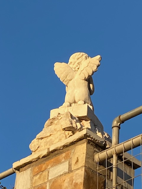 Neben dem alten Kirchlein führt eine mit Gras überwachsene Steintreppe abwärts. Die nehme ich und spaziere nun recht bequem durch einen Hohlweg weiter. Vom bewaldeten Hang her ertönt ein Schuss, und ich beginne, laut zu rufen, mit mir selbst zu reden und sogar zu singen. Die Vögel sollen gewarnt sein! Tatsächlich sehe ich einen großen Raubvogel aufsteigen. Nachdem ich den Ausgang der Schlucht umgangen habe, gelange ich zu einem Komplex aus zusammengeschusterten Gebäuden: Wohnhaus, Kirche, Garten und Umfassungsmauer sind nach und nach offenbar in Eigenarbeit entstanden. Die auffälligsten Bauteile habe ich schon öfter fotografiert, zB diese Engelsputte, die einen Pfeiler schmückt.