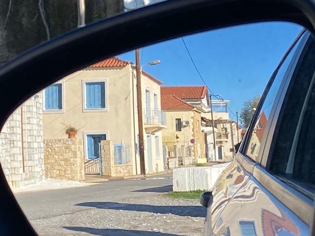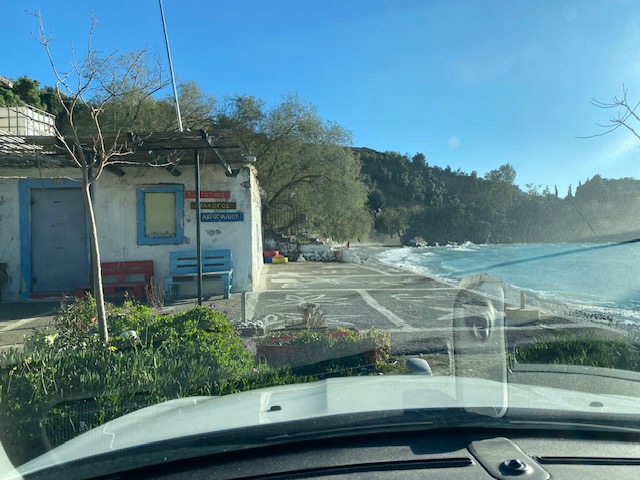 In Akrogiali („glänzenden Küste“) gibt es einen kleinen Laden, und so fuhr ich hin, um Brot und Schafskäse zu erwerben. Außerdem wollte ich mein heutiges Kalenderblatt zeichnen. Das Licht war herrlich, aber der Wind so stark, dass es unmöglich war, draußen zu sitzen und zu zeichnen. Ich tats dann vom Parking des „Verschönerungsvereins“ aus, im Auto sitzend. Dies war der Ausblick.