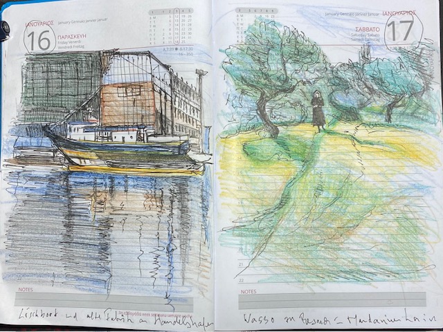 Am 18.1. war Sonntag und wir aßen in „unserer“ Taverne. Eine Vase mit ein paar Blumen stand auf einem der noch leeren Tische. Mit gefiel die Schwarz-Weiß-Zeichnung auch, doch kolorierte ich sie, damit alle Januar-Zeichnungen den gleichen Stil haben.