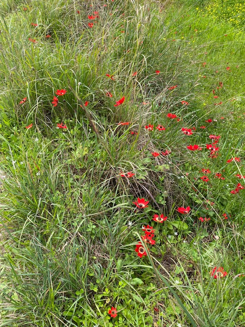 Als ich eben den gewohnten Spaziergang auf unserer Straße in Richtung des Bergdorfes machte, freute sich mein Herz an den Wiesen, die von roten Anemonen, weißen Sternen und blauem Ehrenpreis übersät sind. Das Gras steht hoch, saftig grün und üppig – ganz anders, als ich es bei unserer Durchfahrt durch Arkadien erlebte, wo die Böden ausgetrocknet wirkten und ich mir Gedanken machte, ob womöglich die an allen Horizonten aufragenden Windgeneratoren Schuld daran sein könnten. In früheren Jahren regnete es in Arkadien weit mehr als hier unten, und der Frühling war sehr stark zu spüren.
