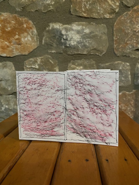 Der Regen rauscht weiterhin auf die Erde, und ich betrachte weiterhin die Steine unseres Hauses. Ich machte auch ein weiteres Mini-Zine mit Abreibungen (Frottage). Diesmal verwendete ich außer Bleistift auch einen roten Aquarellstift und fotografierte die Seiten vor der Steinwand.