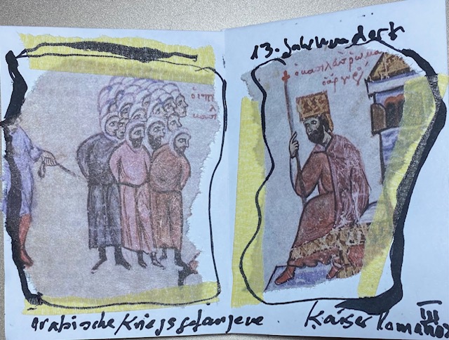 Die nächste Szene führt mich ins 11. Jahrhundert: eine Gruppe arabischer Kriegsgefangener wird dem oströmischen Kaiser Romanos III (968-1034) vorgeführt. 1030 versuchte er, die Araber an der Ostgrenze des Reichs (Aleppo) zu stoppen, wurde aber bei Araz geschlagen. Zu seinem Glück wurde jedenfalls die arabische Flotte in der Adria vernichtet. Diese Szene wurde im 13. Jahrhundert von einem Miniaturenmaler aufgegriffen.