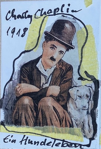 Die Rückseite des Mini-Zine zeigt einen berühmten Landstreicher: Charles Chaplin, auch er mit einem Hund. Es ist das Plakat seines ersten großen Erfolgs, 1918: A Dog’s Life, zu deutsch: ein Hundeleben.
