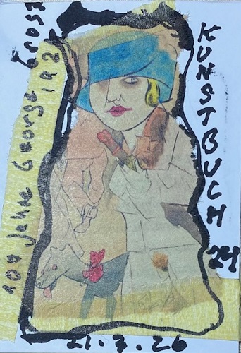 Daraus machte ich ein paar Ausrisse von künstlerischen Illustrationen, beginnend mit den „Passanten“ von George Grosz. Ausgerissen habe ich ein Detail mit einer Dame und ihrem Hündchen. 1926 malte George Grosz das Bild, es ist also genau 100 Jahre alt.