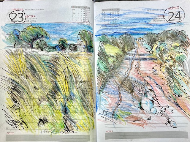 Für den 24. wählte ich einen steil abfallenden ausgewaschenen Feldweg, den ich sehr oft mit Tito wanderte, jetzt eher selten. Die Erde ist hier rötlich, die Steine sind rund und weiß. Gelb leuchtender Ginster säumt den Weg. In der Ferne sieht man den Rundbau („Zentrum des neuen Menschen“, mehr dazu hier), den ein Griechisch-Amerikaner vor langer Zeit errichtete, um dem Weltfrieden zu dienen. Einst war es ein belebter, verglaster Bau, heute steht nur das Betongerüst und als solches ein unverwechselbares Merkzeichen in der Landschaft. Weit unten das Meer und die blaue Küste des ersten Fingers der Pelopones.