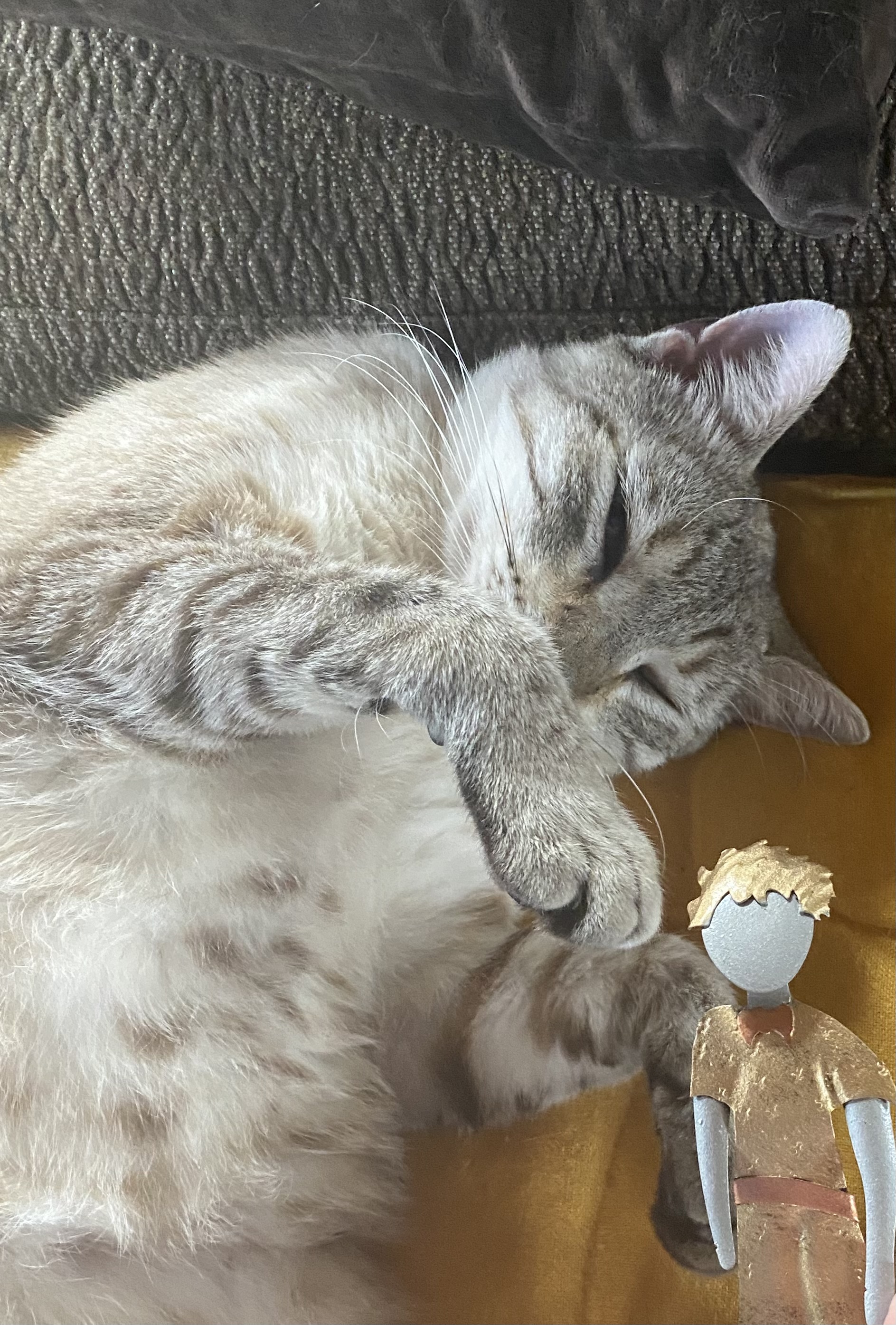 Wie von Wortman angeregt, poste ich jeden Sonntag ein Foto des Kleinen Prinzen in neuem surrounding. Heute machte er dem fröhlich von den Todgeglaubten wieder auferstandene Kater Lin seine Aufwartung. Der Kater konnte mit der scharfkantigen Blechfigur zwar wenig anfangen, öffnete aber bereitwillig seine Pfoten für eine herzliche Umarmung.