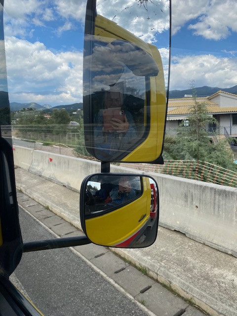 Ich kletterte hinauf und hatte während der Überführung ans andere Ende Kalamatas Zeit, die Künste des Fahrers zu bewundern, der mit dem Riesending fuhr, als sei es ein Motorrad. Auch die Landschaft war von meinem hohen Sitz aus sehr eindrucksvoll, zumal es wieder Neuschnee auf den Berggipfeln zu bewundern gab.