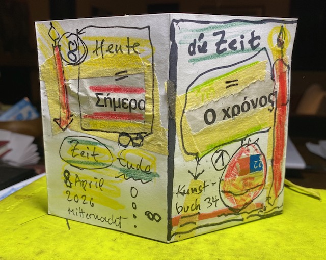 Seite 1 (das Deckblatt): ich dekorierte das Wort χρόνος/hronos (Zeit) mit Osterkerze und Osterei: die sind inzwischen bei euch wohl abgebrannt bzw aufgegessen. Bei uns aber sind sie erst am Kommen.