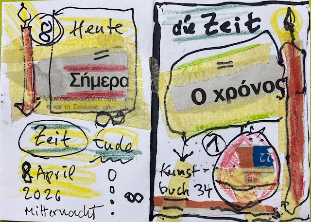 S. 8 (Rückseite): σήμερα/simera = heute ist das Wort. Das war’s, was das Lokalblatt heute, am 8. April, zum ZEITgeschehen vorzubringen hatte. Die Acht wird zum Unendlichkeitszeichen, wenn man sie schlafen legt.