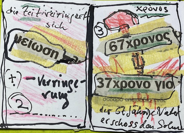 Nun war ich gespannt, was das Blättchen sonst noch zum Thema „Zeit“ bereithalten würde. Ich riss die entsprechenden Wörter aus und lieferte auch die deutsche Übersetzung sowie Kleinstillustrationen dazu. So wurde das Heft zu einer Hilfe zum Erlernen der griechischen Sprache.