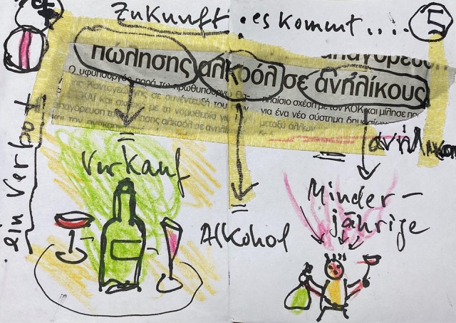 Doppelseite 4-5: Es geht um die künftige Generation (ανήλικοι/aniliki = Unmündige, „Unerwachsene“) und um eine geplante Gesetzgebung (νομοθεσία) – also um die Zukunft. Verboten werden soll der Verkauf von Alkoholika an Kinder und Jugendliche. Wir lernen die Wörter πώληση/polisi = Verkauf und αλκοόλ =Alkohol.