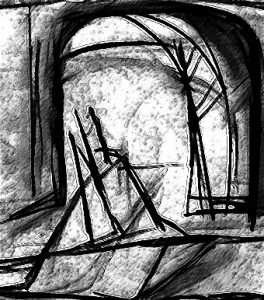 Die letzte Version zeigt eine Struktur mit zerbrochenen eisernen Bögen und Hindernissen, durch die man hinaus gelangen kann. Am Ausgang zeichnet sich ein feiner Bogen ab. Licht flutet hindurch. Ein symbolisches Bild, das aus meinem damaligen Unterbewusstsein mir eine Hoffnung für den heutigen Tag transportiert.