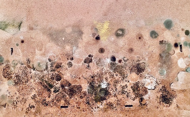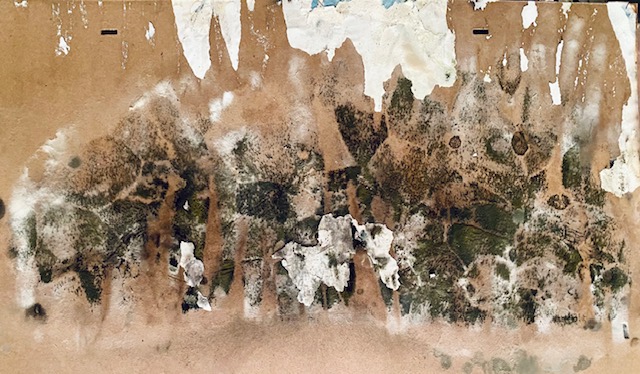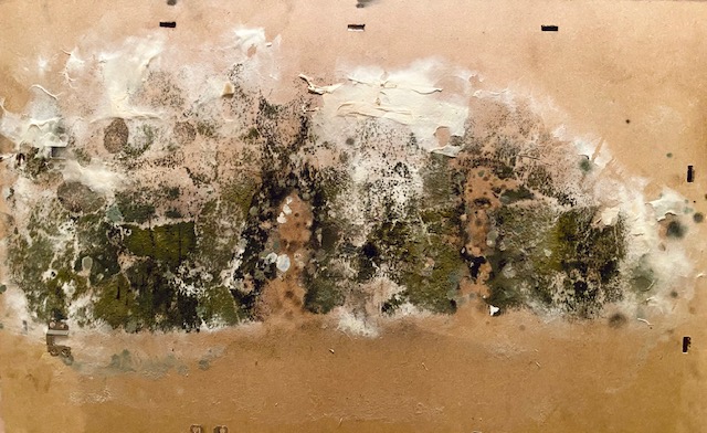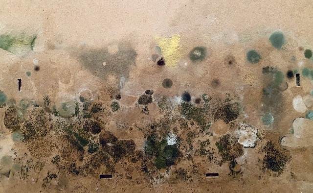 Als ich heute ins Atelier hinunterging, bemerkte ich, dass sich der leichte Schimmelgeruch nicht nur nicht verflüchtigt, sondern sogar verstärkt hatte, und ich machte mich auf die Suche nach der Ursache. Ich fand sie auch: eine Reihe größerer Arbeiten, die ich zwischen Plastikfolie und Pappen gesichert hatte, waren nicht getrocknet. Die Pappen zeigten lebhafte Verfärbungen auf, die mich stark an Myriades Bild No 1 erinnerten.