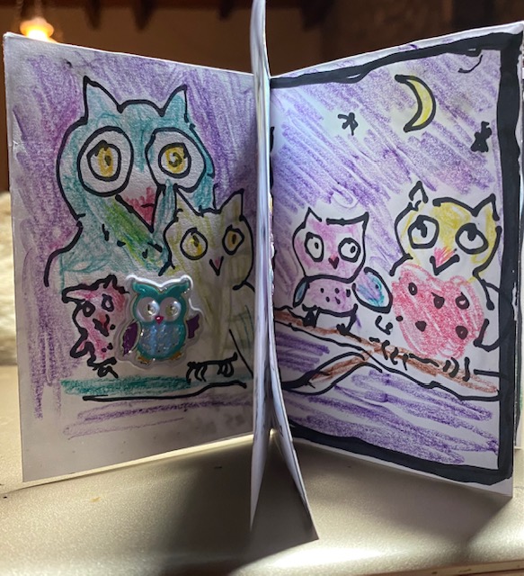 Meine vorerst letzte Kunstbuchkreation, heute wieder am Kamin. Beim Suchen nach einem Thema fielen mir Eulenaufkleber ins Auge – danach war alles einfach.