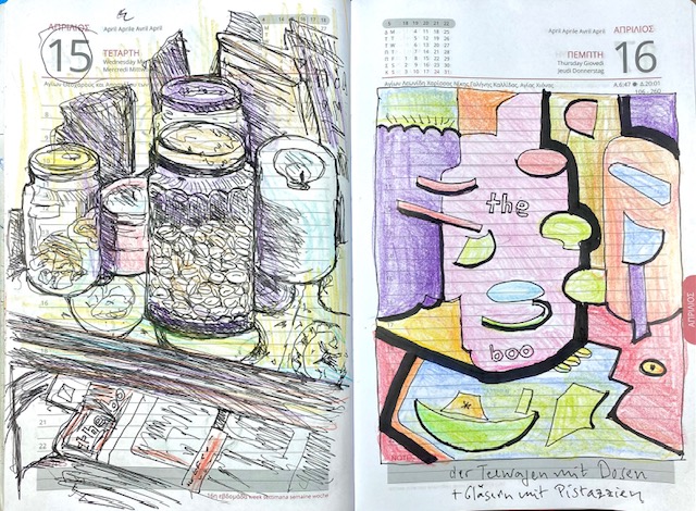 Kalenderblätter 15.-18. April, Stillleben und drei Variationen (Emanzipation geometrischer Elemente 5)