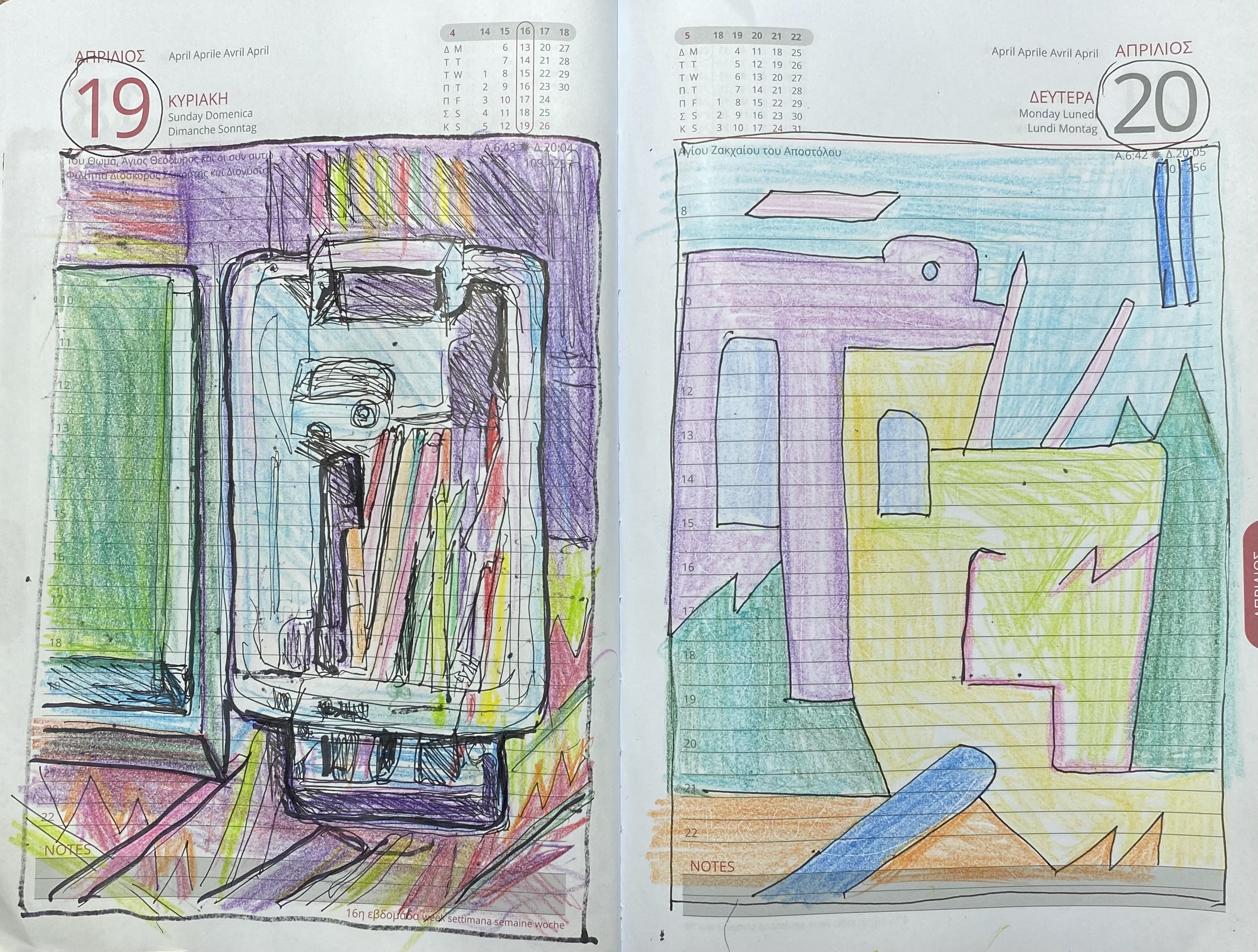 Im Kalender zeichnete ich ein Stillleben mit einer Box für die Buntstifte und eine farbige Variante, für die ich Elemente der Ausgangszeichnung benutzte. Ihr kennt das ja schon: meine Idee für den verrückten April.