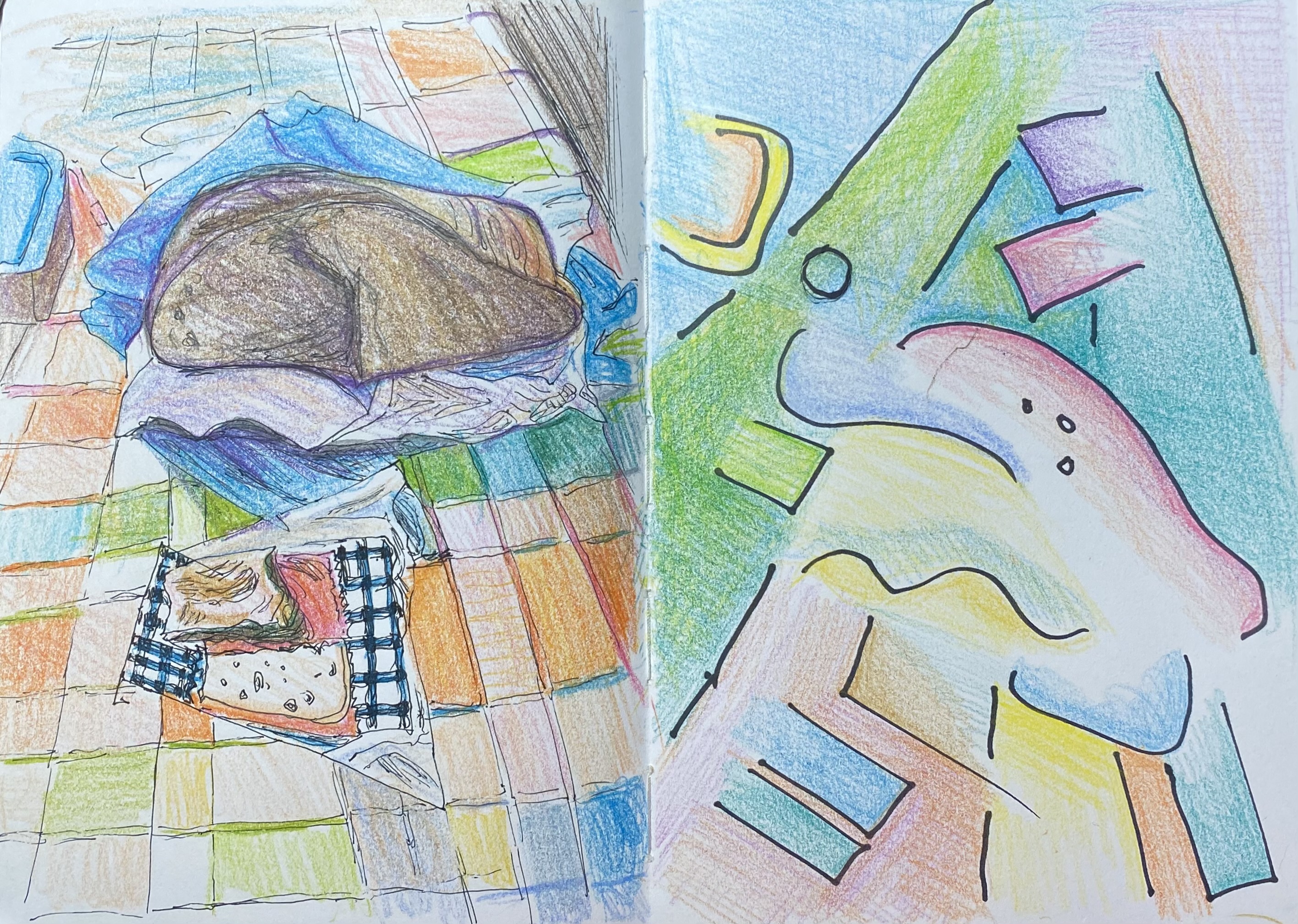 In der Küche sah ich einen grob angeschnittenen dunklen Brotlaib und eine karierte Serviette mit Brot und Spinatpita, und fand, dass sie zusammen mit dem stark farbigen Tischtuch ein gutes Sujet wären. Auch diese Zeichnung verwandelte ich dann wie gehabt.